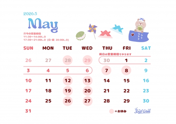 SoulGrill 5月・GWの営業日のお知らせ 2026-04-27 13:24:49 🎏5月営業日のお知らせ🎏ゴールデンウィーク期間【4/30(金)~5/6(祝・水)】は祝日の営業時間で営業いたします🙇♂️45/5,6は火・水ですがOPENします🍔代わりに7日、8日はお休みとなりますがそれ以外は通常通り火・水定休です。日曜・祝日の営業時間11:30 - 14:00 L.O.17:30 - 20:00 L.O.5月もご来店お待ちしております🌱